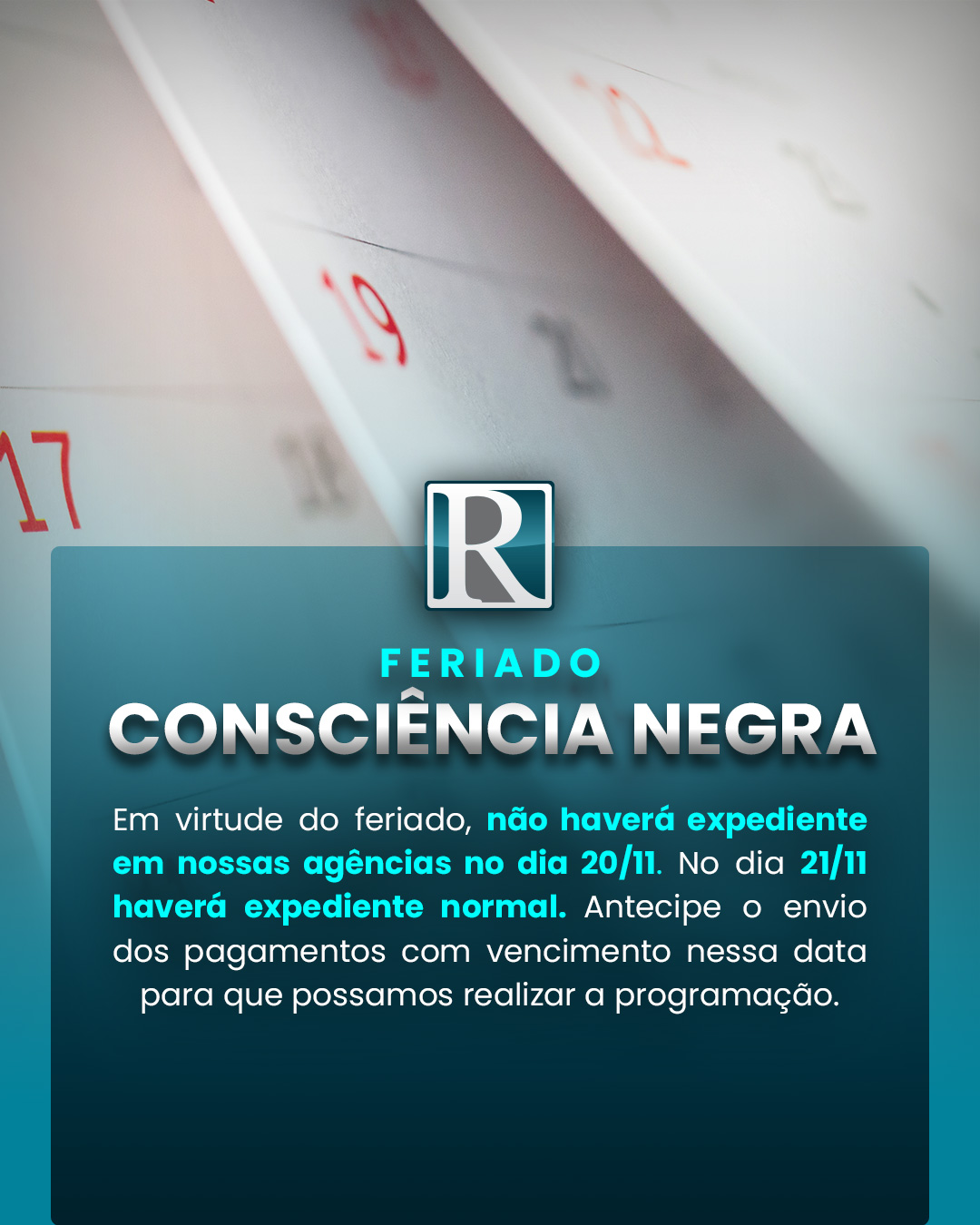 Prezados Clientes, informamos que, em virtude do feriado do Dia da Consciência Negra, não haverá expediente em nossas agências – Niterói e Centro do Rio – no dia 20/11/2025 (quinta-feira).